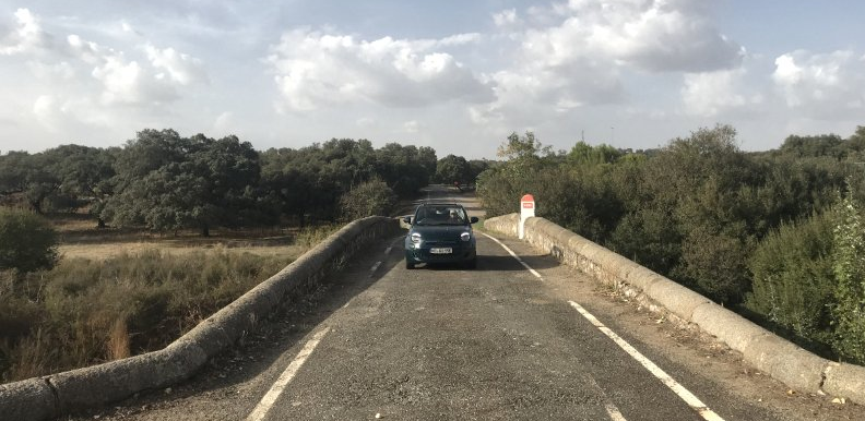 Überall Federn. Sie umwirbeln mich wie ein Schneesturm. Auf der ausnahmsweise vierspurigen Nationalstraße überholte mich vor wenigen Sekunden ein Transporter. Er fuhr viel zu schnell. Ich kann nur hoffen, dass die Geschwindigkeit seiner empfindlichen Fracht geschuldet ist. Hunderte von Truthähnen schauten im Vorüberfahren durch verschmutzte Gitterstäbe. Das Federvieh ist wohl nicht auf dem Weg in die Freiheit. Das Verdeck habe ich längst geöffnet, und so werde ich am Nachmittag noch Federn unter dem Sitz finden. Kurz nach dem Start am Morgen entsprach die Reihenfolge meiner Anpassung an die Außentemperatur der eines jeden Morgens in den vergangenen Tagen: Gegen halb 10 zog ich die Strickjacke aus. Kurze Zeit später öffnete ich das Fenster einen guten Spalt. Um halb 11 war das Verdeck unten. Es zieht kein bißchen im Nacken, ein Windschott braucht der Wagen nicht. Pebbles hat zwar eine Klimaanlage, aber diese „spezielle“ Luft daraus mag ich nicht besonders. Was nicht ausschließt, dass ich mich im Winter und bei brüllender Hitze über die Anlage freue. Rechts von mir leuchtet etwas zwischen sanften Hügeln in der Ebene, so hell wie die Sonne. Eine Sonne, die auf einer Art Riesenmast thront. Ich erfahre, dass dies ein Solarkraftwerk ist – 624 bewegliche Spiegel am Boden bündeln das Sonnenlicht auf diesen einen Punkt in der Höhe. Heraus kommen 23.400 Megawattstunden im Jahr. In der Argarregion Andalusien wirkt die Anlage wie ein futuristischer Ausrutscher. Im Vorüberfahren ziehen endlose Olivenbaumplantagen an mir vorbei. Menschen auf Leitern sind bei der Ernte. Sie pflücken die Oliven mit der Hand, haben keine dieser Maschinen, die unsanft am Baumstamm rütteln, um die Hunderte von Früchten auf den Boden zu befördern. Es folgt ein Stück freies Ackerland. Traktoren ziehen gewaltige Staubfahnen hinter sich her, als sie den knochentrockenen Boden für die nächste Aussaat aufreißen. Hier den Traktoren versammeln sich Vögel. Es sind nicht wie bei mir zuhause Saatkrähen, sondern Trupps schneeweißer Silberreiher, die versuchen, Reste der letzten Ernte und aufgescheuchte Kleintiere zu ergattern. Es wird Zeit zu laden. Meine Mobility-App führt mich zum nächstgelegenen Punkt – an einer Porschevertretung. „Solo por cliente“ steht auf dem Schild neben den beiden Ladesäulen. Das ist jetzt blöd. Ich gehe rein. Der Herr am Counter meint auf meine Nachfrage, dass ich hier nicht laden könne. Eine Frau kommt dazu, und mit einem Seitenblick auf den Herrn meint sie an mich gewandt: „Wo steht denn Ihr Wagen? Ein Fiat? Natürlich können Sie hier tanken!“ Glücklich schließe ich Pebbles an und beobachte etwas misstrauisch, ob er an dieser Powerstation kein Feuer fängt. Man weiß ja nie … Stattdessen ist er nach neun Minuten von 35 % wieder auf 84 %. Der Weg führt jetzt Richtung Huelva. Ich erreiche unter einem strahlend blauen Himmel die Costa de la Luz. Ein starker Ostwind schiebt mich schnurstracks nach Westen, so dass die Maschine nur 9,9 KWh auf die nächsten 100 Kilometer verbrauchen wird. Noch 30 Kilometer bis zur Grenze nach Portugal.