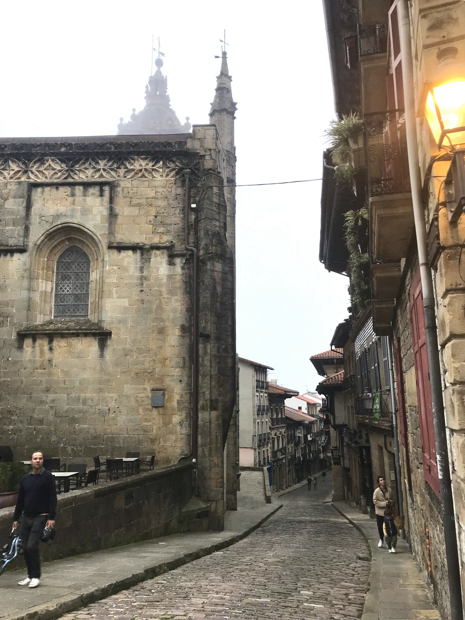 Aus heiterem Himmel heraus türmt sich plötzlich eine Nebelwand über der Straße. Das Licht wird unwirklich, die Sonne erscheint ab und zu als bleiche Scheibe hinter den wallenden Nebelfetzen. Ich suche nach dem Schalter für die Nebelschlussleuchte, kann sie aber nicht finden. So schnell, wie der Nebel fiel, verschwindet er. Die diesige Wolke, die sich nun von einem Berghang aus auf die Straße wälzt, hat eine andere Ursache. Hunderte Schafe werden zum Abendzeit ins Dorf hinunter getrieben und wirbeln viel Staub auf. Ich übernachte in Hondarriba, der ersten kleinen Stadt auf spanischer Seite.